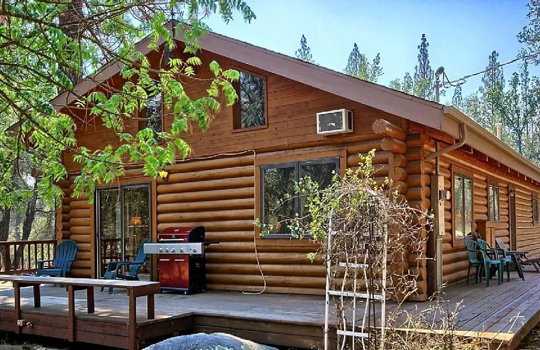 Cozy Log Cabin Near Yosemite National Park In California features a refrigerator and kitchenware provided in an equipped kitchen.